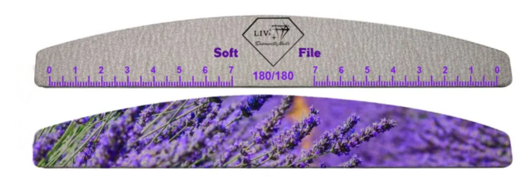La lima 180/180 soft de LIV Diamante Nails es ideal para el limado delicado y el alisado final. Gracias a su grano fino y su forma ergonómica de media luna, es perfecta para preparar la uña natural o suavizar superficies sin dañar la placa ungueal. El diseño de lavanda en el reverso aporta un toque relajante y elegante a tu mesa de trabajo.